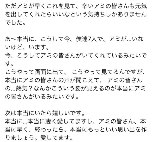 彼らもファンと会うことで勇気をもらっていると聞いて、早くそのような状況になれることを祈ります。