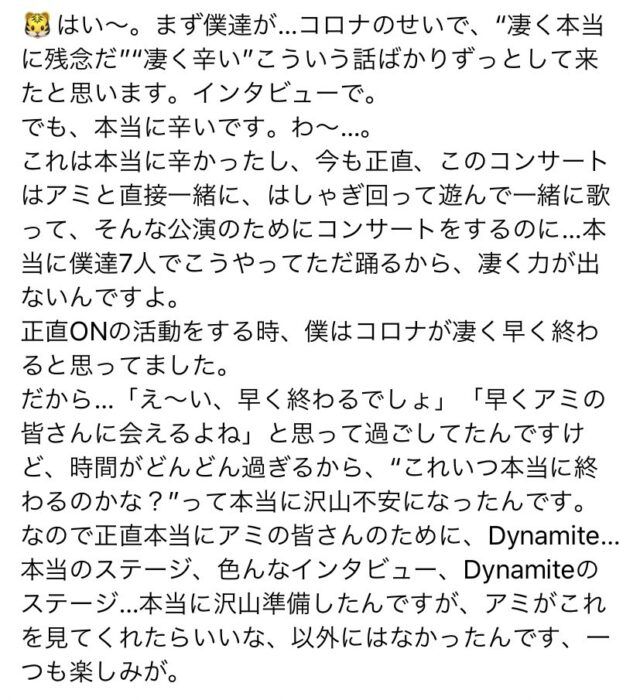 2020年から新型コロナウイルスの影響でオフラインでLIVEができなかったり、直接ARMY(ファン)と会う機会がなく7人だけで踊ったりするので力が出ないということでした。