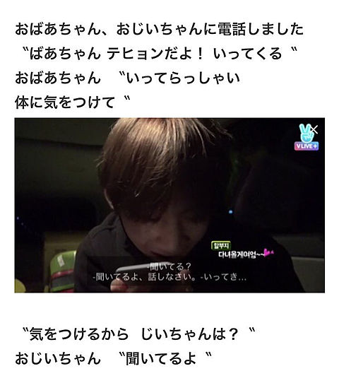 「 両親のように育ててくれた人で、やりたことをやらせてくれた、食べたいものを食べさせてくれた、駄々をこねても聞き入れてくれた。 そして、本当に他の人にとっても僕にとっても記憶に残っている大切な人なんです。 僕にとっても大切で大切で・・そんなおばあちゃんが亡くなったなんて、信じることが出来ませんでした。 ぼくたちがMusic Bankで1位を獲得したその日、おばあちゃんの四十九日でした。 おばあちゃんは生前から僕がテレビに出ているのを見たいと、たくさん見たいと話していて、おばあちゃんが見ている前で1位を取って報告したかったけど叶いませんでした。 それが、僕にとっては悔しいですが、大切なおばあちゃんはファンを沢山愛しなさいと言ってくれていました。 1位を取れたのも、ドームの舞台に立てたのも、今回の血・汗・涙での活動で目標に近づけたのも、全部全部アーミーの皆さんのおかげだと思います。 そして、おばあちゃんも空から僕たちを応援してくれていると思います。 僕もそう信じて、これからも一生懸命活動していくので、僕の愛するアーミーの皆さんも僕にとって大切なおばあちゃんの存在をいつまでも覚えていてくれると嬉しいです。 ありがとうございます。」